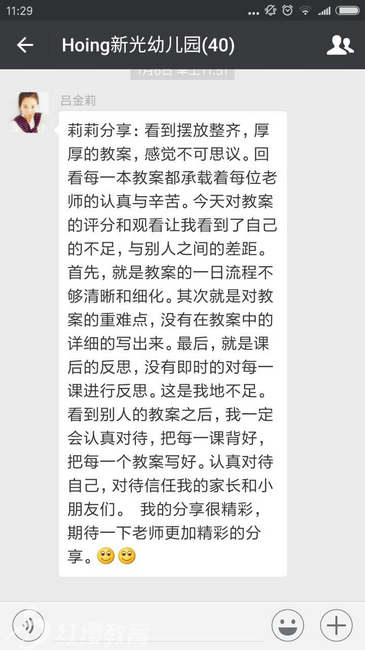 本次活動采用了不記名評比打分制,提前把教師的備課本編號,為的是讓老師能排出其它因素,公平、公正的對備課本進行評價?;顒又?,老師們分別通過“字跡工整、書面整齊”、“半日流程詳細”、“堅持課后反思總結”、“重點、難點突出”四個方面對備課本進行評價打分。在翻閱老師的備課本時,不時會聽到“哇,這個半日流程寫的真詳細”、“還有重點難點呢”、“還用不同顏色的筆做重點標記”等贊許的語言,老師們在翻閱的過程中給予了很好的評價,同時也進行了自我反思,并在活動結束之后把自己反思到的不足在微信群與大家作了分享。